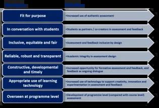 What is assessment and feedback and why it is important; University of Edinburgh assessment and feedback principles and priorities; and programme-level assessment. What is assessment and feedback?This may seem obvious: universities teach and need to assess student learning to grade and award degrees and other qualifications. We need to know our students are learning what they need to learn and have good preparation for their future lives and careers. Both modes of assessment and feedback can have a big influence on how students work. Broadly there are two categories of assessment: summative and formative.Summative can be seen as assessment of learning and often happens at the end of a course and determines what grades they get. Formative assessment is intended to help students learn (assessment for learning) and it can both give them a sense of development and help them learn and practice new things. Ideally, through experience, students start gauging the quality of their work and can make their own evaluations of their learning (assessment as learning).Feedback is part of the assessment process that can help students in their learning. Typically, this is made up of comments on work students have completed and is intended to help them improve their work in future. Feedback can more productively be seen as a process of dialogue between students and teachers rather than as a commodity produced by teachers for students. Feedback information can come at any time and from any source.Why is it important?Assessment and the feedback students get can be a big influence on their behaviour and experience of studying at university. They are both important elements of coherent course and programme design. Good assessment and feedback practices can help our students learn, motivate them to engage and develop their own independence and agency. Your assessments should offer students a chance to articulate the Skills for Success that they have developed on your course. This is important to allow students to capture learning that can sometimes be hidden within the discipline content. You’ll see below that the University has developed some assessment and feedback principles and priorities that will help enhance not only our assessment and feedback practices but also connect with the other sections of this site.Assessment and feedback principles and prioritiesThe following resources outline the assessment and feedback principles and priorities that form a new framework for reviewing and guiding practice.University of Edinburgh Assessment and Feedback Principles and Priorities (PDF) (Policy document, 10 pages)Assessment and Feedback – Principles and Priorities (Teaching Matters Blog post)The principles and priorities are oulined in the below diagram, with a written summary of the diagram following. Summary of University of Edinburgh assessment and feedback principles and priorities Summary of diagram - assessment and feedback principles and prioritiesFit for purpose - increased use of authentic assessment.In conversation with students - students seen as partners / co-creators in assessment and feedback.Inclusive, equitable and fair - assessment and feedback is inclusive by design.Reliable, robust and transparent - academic integrity built into assessment design.Constructive, developmental and timely - with increased opportunity for formative and assessment and feedback, and feedback as ongoing dialogue.Appropriate use of learning technology - Increased use of technology to support creativity, innovation and experimentation in assessment and feedback.Overseen at programme level - Development of programme level (compared with course level) assessment.Programme-level assessmentWhat is it?Planning, conducting and overseeing assessment and feedback holistically across programmes rather than focusing on assessment at the course level. This means assessment and feedback can build progressively on experience across the programme lifecycle.Why is it important?Programme-level assessment allows mapping of assessments across the whole programme which can be important in identifying overassessment, deadline log jams and other pressure points. It can help study across a programme to be experienced as a coherently joined up experience for students. Ensuring students have a coherent learning experience across a whole programme helps them to develop their own understanding of the assessment process and to experience feedback as part of a developmental journey. This, in turn, can lead to enhancement of the educational experience and promote greater student satisfaction.Programme learning outcomes can be tested across programmes in a more holistic way through programme teams working and planning together above the level of the course. It can also help to reduce both staff and students’ workloads through removing unnecessary elements.For more details, you can read the following resources:Programme-level assessment Curriculum Transformation Hub sharepoint pages: A useful overview of work being undertaken at the University on programme-level assessment, including discussions with Schools.Programme-level assessment: What is it, and why is it important?: A Teaching Matters blog post by Prof Patrick Walsh and Dr Neil Lent unpack what ‘programme-level assessment’ means, and explain why it is an important approach for effective curriculum design.Thinking programmatically about your thinking programmatically about your assessment and feedback practices: The programme spring-clean (PDF, 4 pages): This Heriot-Watt PDF guide by Sally Brown and Kay Sambell provides practical advice for teaching teams who would like to review and refresh assessment and feedback approaches at a programmatic level.Charlton, N., & Newsham-West, R. (2024). Enablers and barriers to program-level assessment planning. Higher Education Research & Development, 1–15.Next stepsLearn more about embedding assessment and feedback in your practiceRead, watch a