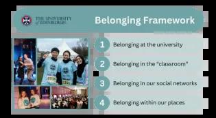 What is meant by wellbeing, community and belonging, and why is it important? What is meant by wellbeing, community and belonging?Learning is a social experience. The relationships that are created between educator and student, and between student and student, matter, and can have an important impact on a student’s sense of belonging and wellbeing whilst at university. Creating space for genuine opportunities for dialogue between peers and with educators, in formal and informal settings, can help to foster relationships that centre around an ethic of care. This type of learning is often referred to as relational pedagogy (Bovill, 2020).Why is it important?A sense of belonging can affect all aspects of a student’s time whilst at university, from academic achievement and sense of mental wellbeing, to whether or not the student remains at university (Klasik & Strayhorn, 2018). Demonstrating to students that staff care can have a strong impact on their sense of belonging. This can take place in a formal classroom setting, such as showing you know students’ names, or informally by simply asking students how they are doing over a cup of tea. There is further support offered by the University’s Student Wellbeing Service, which provides a range of health and wellbeing services to all University students.The University’s Sense of Belonging task group has created a useful guide for Schools on ‘Fostering a Sense of Belonging at our University - PDF‘ that we encourage you to read through.Similarly, we recommend that you take a look at the work on wellbeing in the University of Edinburgh curriculum that is being undertaken as part of the curriculum development. Belonging framework - adapted from the University of Edinburgh's 'Fostering a Sense of Belonging at our University' guide Text from the above diagram - University of Edinburgh Belonging Framework Belonging at the universityBelonging in the "classroom"Belonging in our social networksBelonging within our placesNext stepsLearn more about embedding wellbeing, community and belonging in your practiceRead, watch and listen to a range of additional resources about wellbeing, community and resources This article was published on 2024-11-08